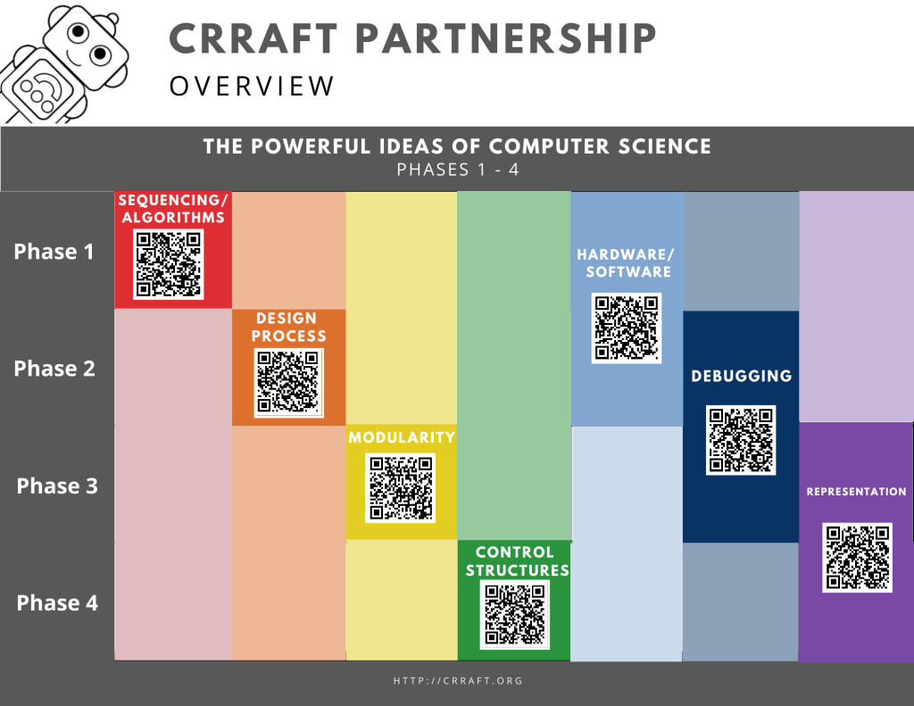 The CRR program is designed to help you engage children in computer science activities during class. There are 4 phases in the program that engage children with 7 powerful ideas of computer science. The phased approach gradually emphasizes these powerful ideas explicitly, but children are engaging with ALL powerful ideas in every phase.