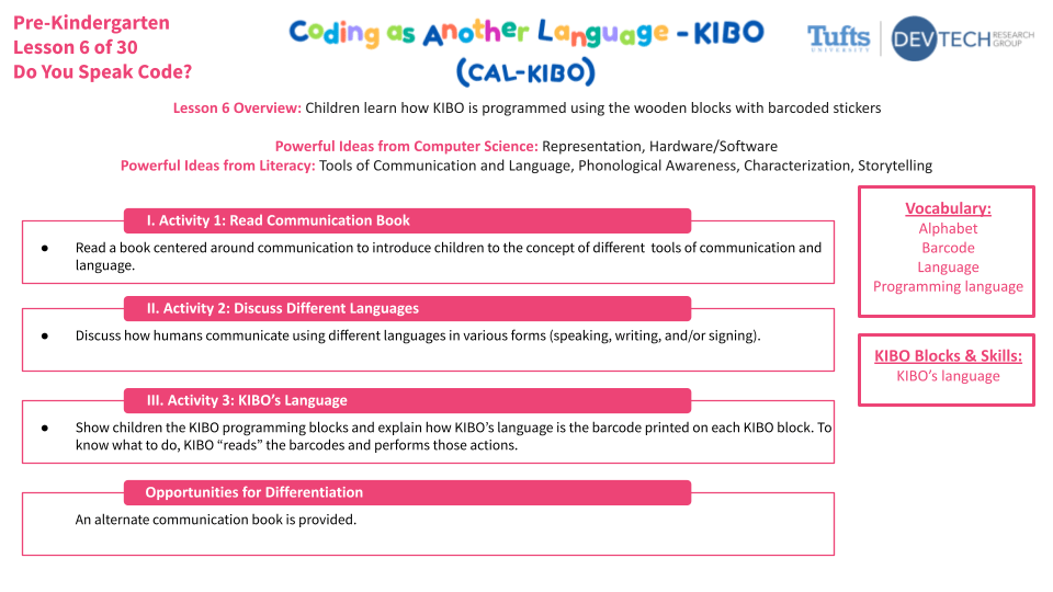 A lesson from the CAL-KIBO Curriculum in which students consider different languages, including spoken, written, and programming languages.